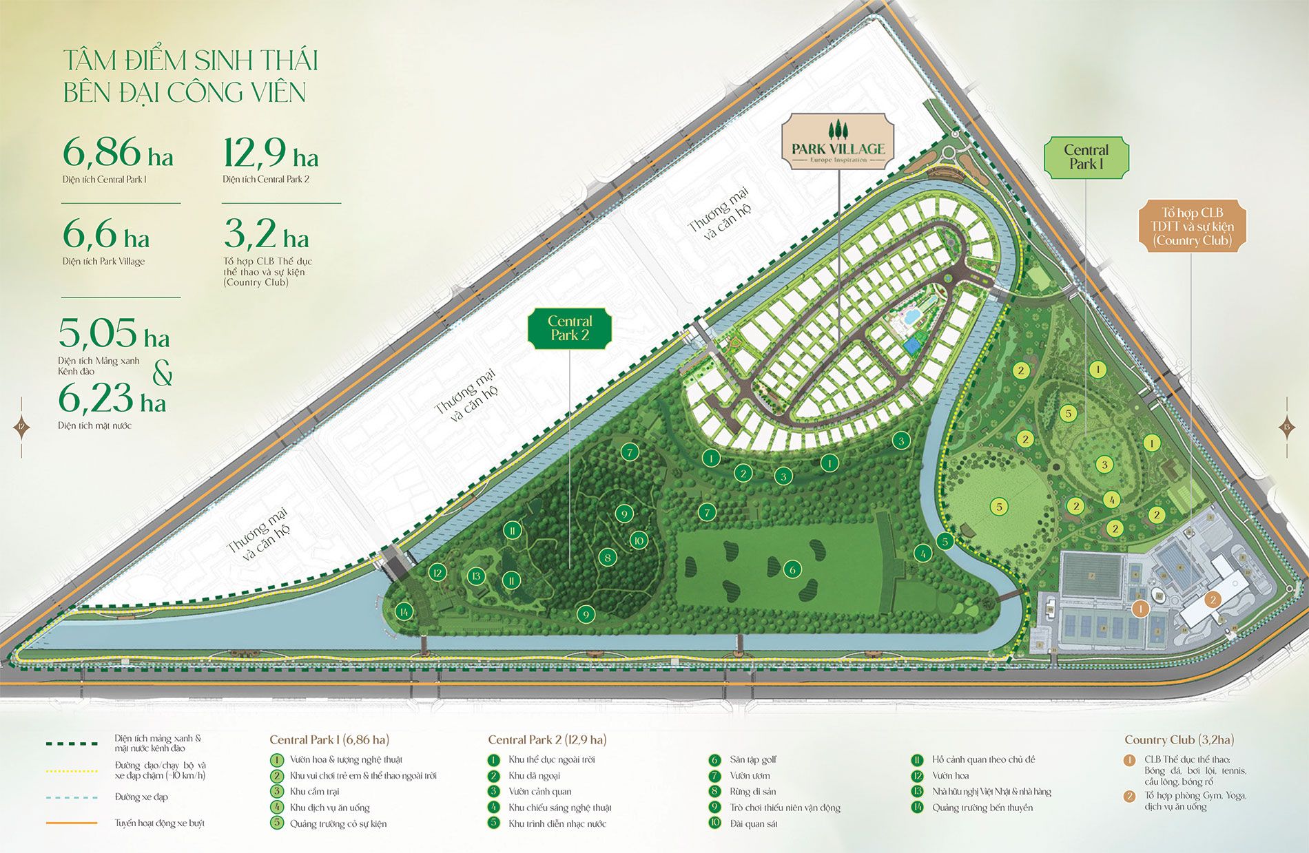 Xung quanh Park Village là các phân khu khác như phân khu South Gate, Rivera, Aquaria. Đây cũng là nơi có mức độ phủ xanh và cảnh quan thiên nhiên lớn nhất trong toàn dự án với công viên trung tâm rộng 25ha và 3.2km kênh đào. Park Village Waterpoint không chỉ mang đậm tính sinh thái mà còn là nơi đem lại nguồn sinh khí hưng thịnh cho gia chủ.