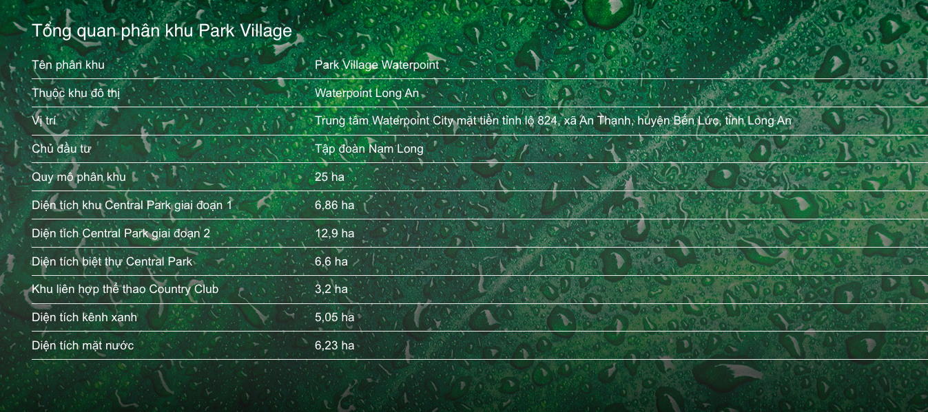 Park Village là phân khu nằm trọn vẹn trong đại công viên Central Park, sở hữu vị trí “kim cương” hiếm có với ba mặt giáp nước, tạo nên không gian sống biệt lập, thanh bình và riêng tư tuyệt đối. Đây là nơi duy nhất trong đại đô thị Waterpoint có thể khai thác tối đa giá trị nghỉ dưỡng và đầu tư lâu dài.