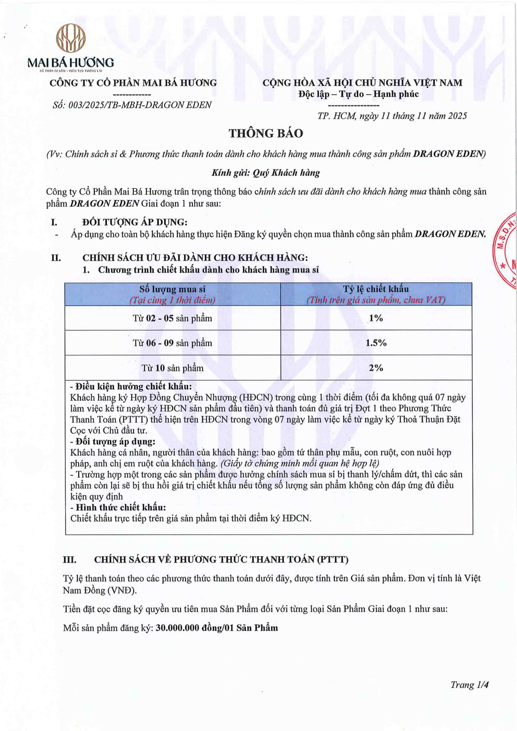 Phương thức thanh toán chuẩn : Khách hàng được chiết khấu 1% trên tổng giá bán chưa bao gồm VAT