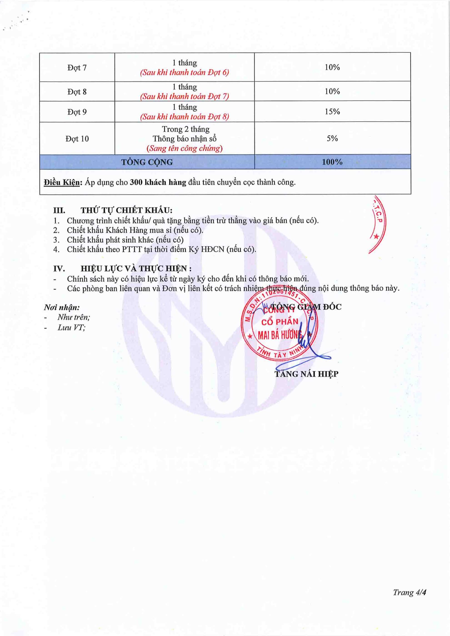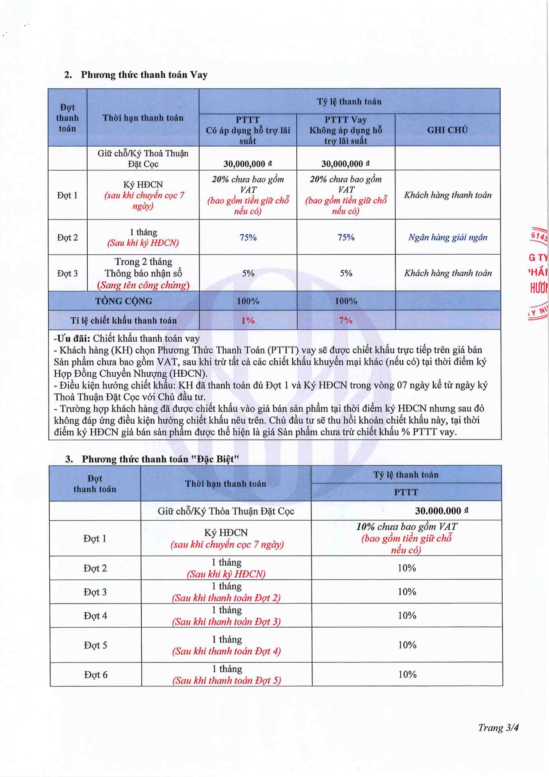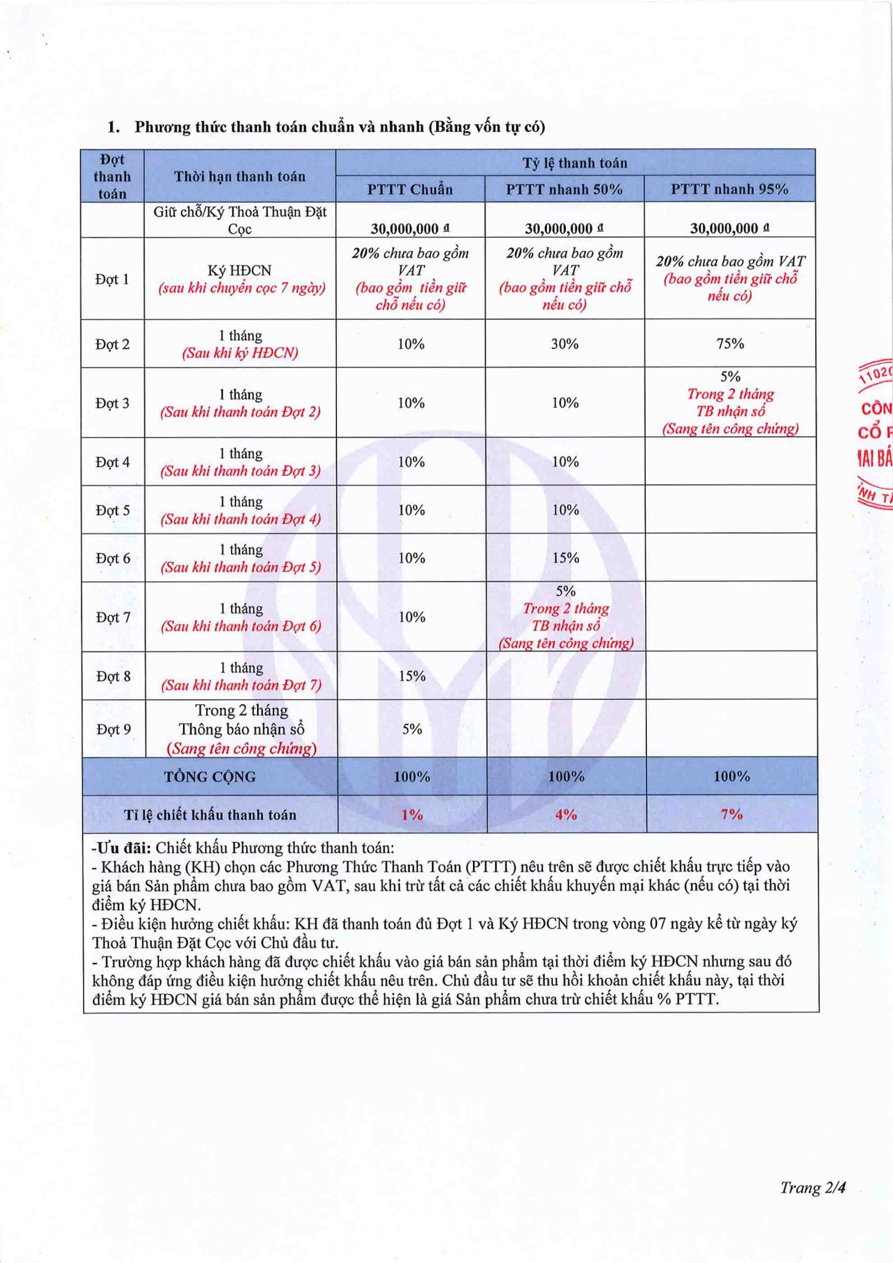 Phương thức thanh toán nhanh 50% : Khách hàng được chiết khấu 4% trên tổng giá bán chưa bao gồm VAT