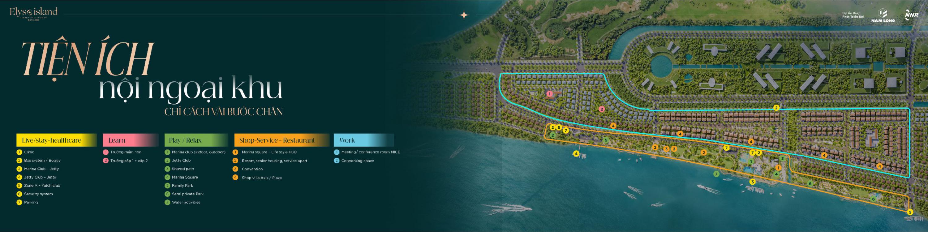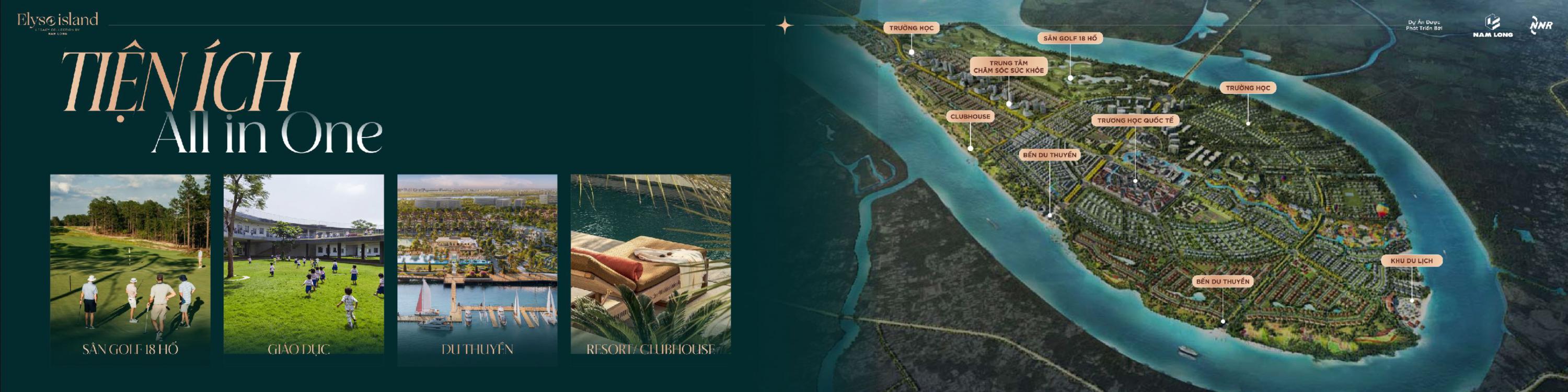 Dự án Elyse Island Nam Long sở hữu hệ tiện ích cao cấp như: Trung tâm thương mại, y tế, trường học, bến thuyền, công viên, quảng trường... và hệ thống tiện ích ngoại khu có sẵn: