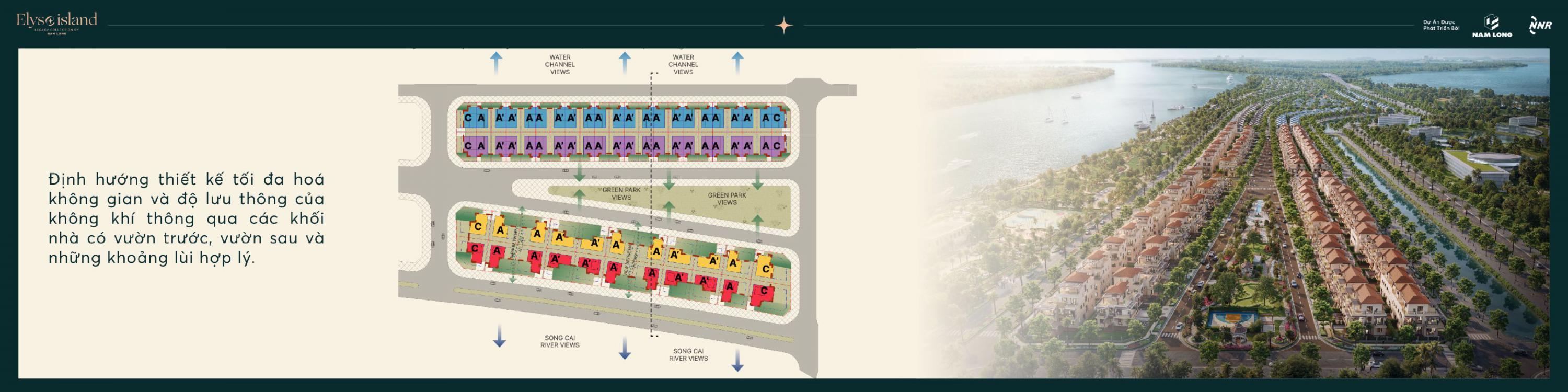 Mặt bằng tổng thể được quy hoạch mạch lạc, kết nối bởi trục đường chính chạy dọc đảo, cùng hệ thống công viên ven sông, hồ cảnh quan, quảng trường và tiện ích cộng đồng. Mỗi khu nhà ở được đặt giữa không gian xanh rộng lớn, đảm bảo mật độ xây dựng chỉ khoảng 30%, còn lại dành cho công viên, mặt nước và tiện ích nghỉ dưỡng.