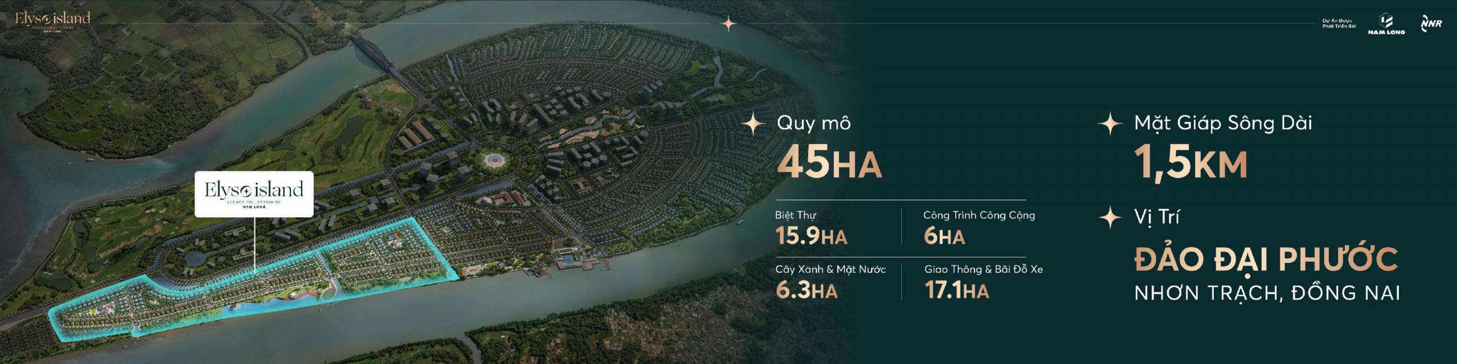 Dự án Elyse Island Nam Long Đại Phước được Nam Long Group phát triển theo triết lý “đảo trong đảo – sống giữa thiên nhiên”, mang đến không gian sống biệt lập nhưng vẫn kết nối hoàn hảo. Toàn khu có quy mô 45,5ha, được chia thành 2 phân khu chính: Zone B và Zone C, bố trí hài hòa theo dòng chảy sông Đồng Nai, ôm trọn cảnh quan sông nước và mảng xanh tự nhiên.