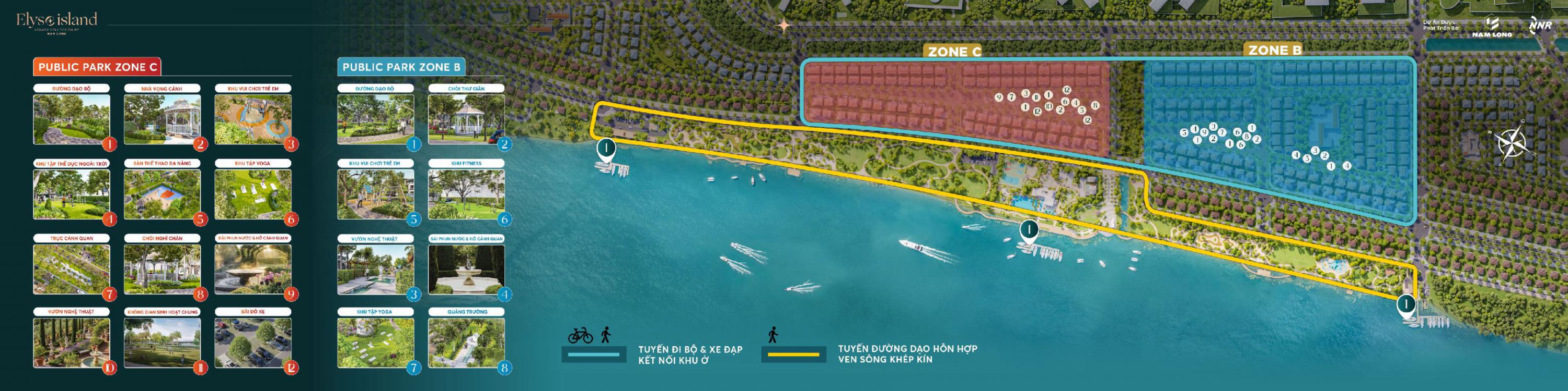 Zone C là khu vực ven sông đắt giá nhất, nơi các căn River Villa sở hữu tầm nhìn panorama hướng sông Đồng Nai. Dọc bờ sông được quy hoạch công viên ven sông dài hơn 1km, kết hợp bến du thuyền, sân tennis, vườn thiền và quảng trường nước – mang lại trải nghiệm sống “resort ven sông” chuẩn quốc tế.