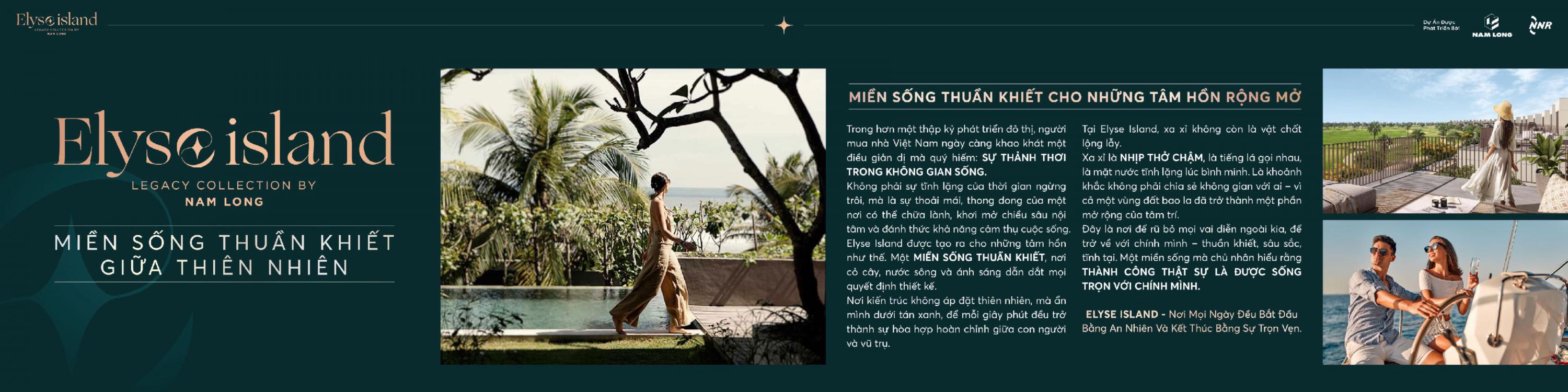 Elyse Island là khu đô thị sinh thái cao cấp do Tập đoàn Nam Long (Nam Long Group) hợp tác cùng Nishi Nippon Railroad (Nhật Bản) phát triển, được xem là biểu tượng sống xanh ven sông Đồng Nai. Với quy mô 45,5 ha tọa lạc tại đảo Đại Phước, Nhơn Trạch, Đồng Nai, dự án mang đến phong cách sống cân bằng giữa thiên nhiên và tiện nghi hiện đại, tạo dựng cộng đồng thượng lưu biệt lập nhưng vẫn kết nối linh hoạt với trung tâm TP.HCM và sân bay quốc tế Long Thành.