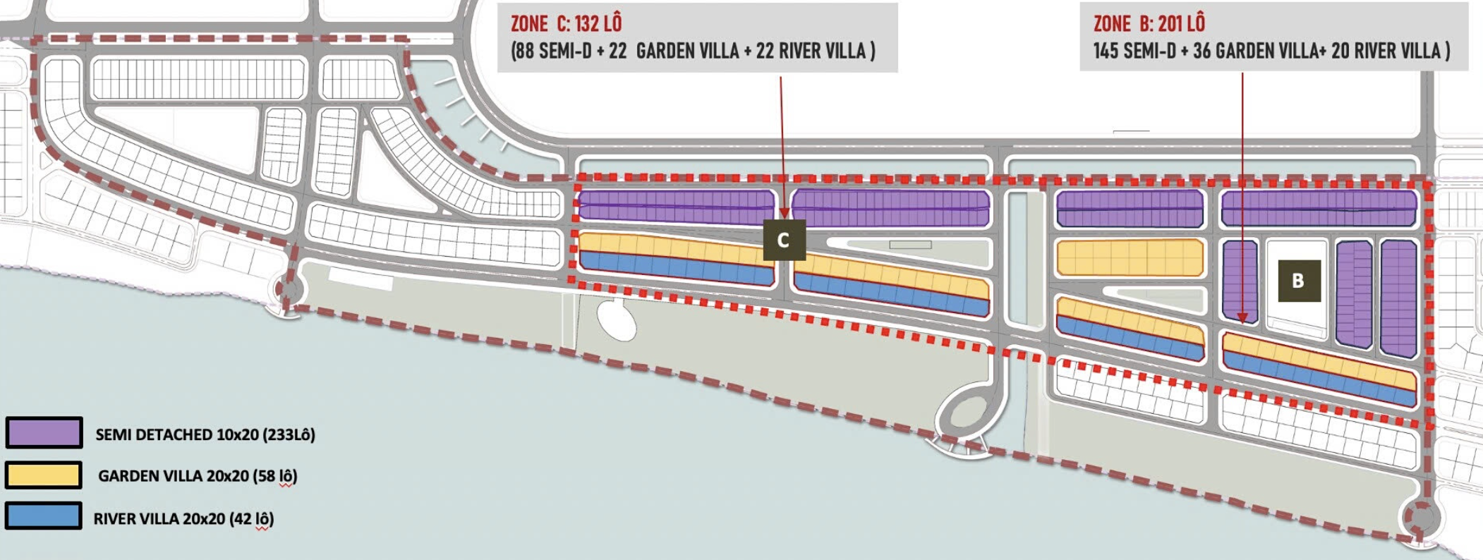 Phân khu Zone B nằm ở trung tâm đảo, quy mô 201 lô, gồm: