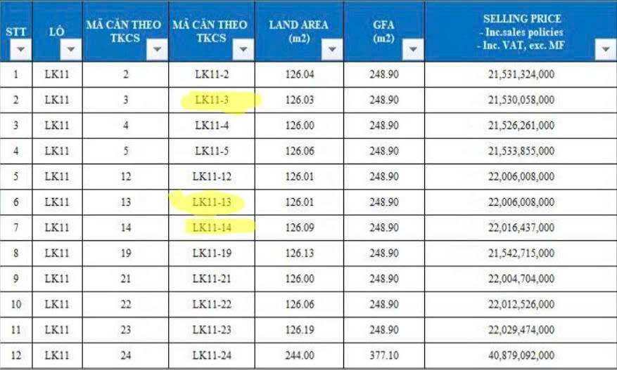 - Giá bán nhà phố từ 21 - 25 tỷ